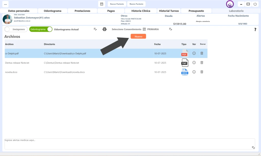 2) El siguiente paso sera presionar el boton "Nuevo" para buscar en nuestro dispositivo el archivo que deseamos agregar a la historia clinica del paciente:
