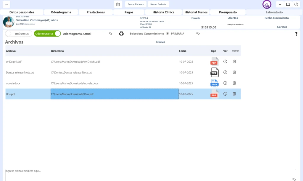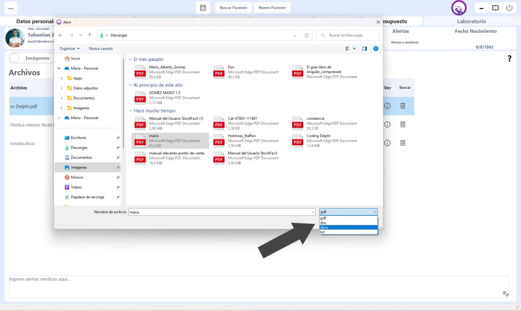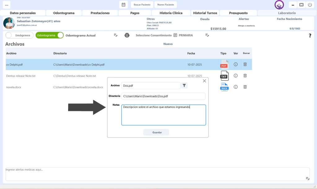 Para poder agregar a la historia clinica de nuestro paciente distintos archivos, con formatos (.pdf, .doc, .docx, .txt) tenemos que realizar los siguientes sencillos pasos: