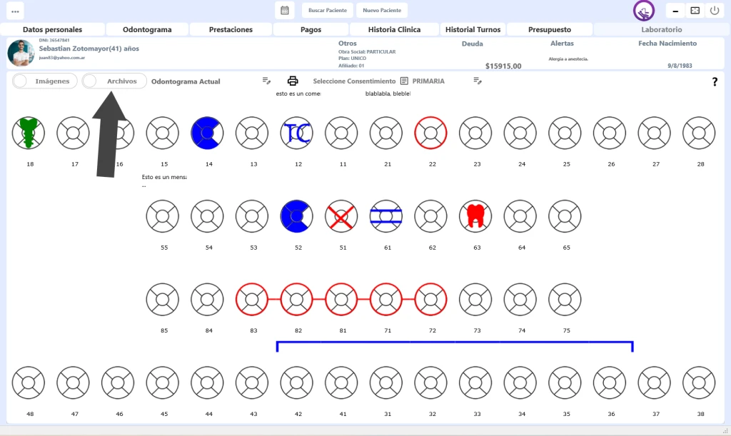 1) Una vez estamos en el odontograma debemos habilitar el modulo presionando el boton "Archivos" como figura en la imagen: